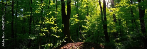 Obraz premium Sunlight streaming through rich green leaves in a serene forest setting, natural, shadows