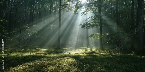 Fototapeta premium Sunlight Streaming Through Serene Forest Trees in Early Morning