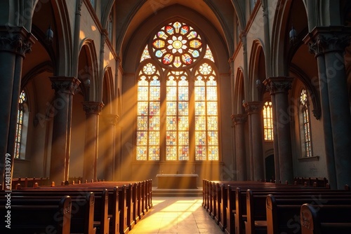© Sunisa, Fototapeta premium Sunlight streaming through stained-glass windows in a church, window, vintage