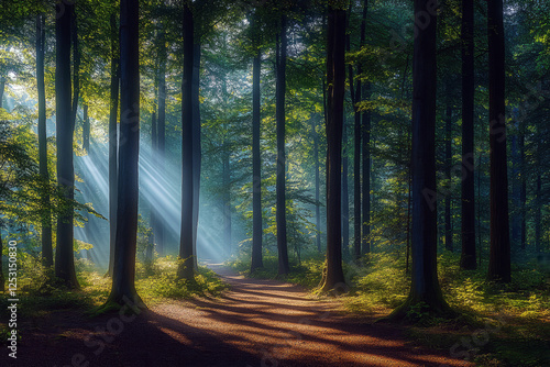 Fototapeta premium Sunlight streaming through tall, dense trees in a lush, vibrant forest with...