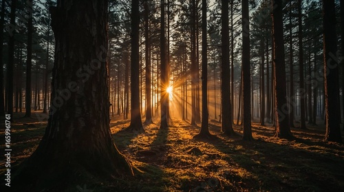 © Shubhard, Obraz premium Sunlight streaming through tall forest trees