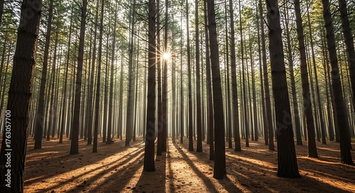 © MdFoysalAhmed, Naklejka premium Sunlight streaming through tall trees in a dense forest casting long shadows on the ground below