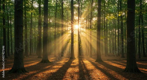 © Thecreator T, Fototapeta premium Sunlight streaming through tall trees in a forest casting long shadows on the ground covered in leaves
