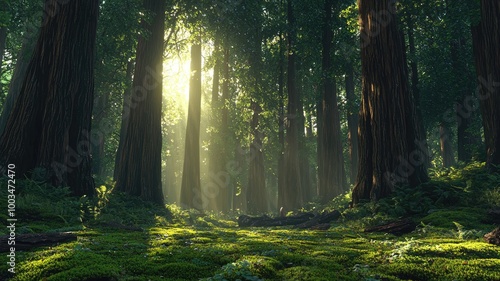 Obraz premium Sunlight Streaming Through Tall Trees in a Lush, Green Forest