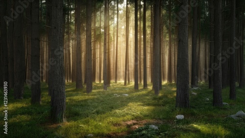 Fototapeta premium Sunlight streaming through tall trees in a serene forest setting with lush green grass and scattered stones illuminated by soft golden light.
