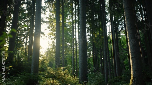Obraz premium Sunlight streaming through tall trees in peaceful forest showcasing natural...