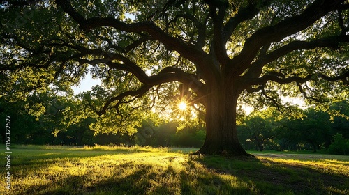 © Abubakar, Fototapeta premium Sunlight streaming through the branches of a towering oak tree, with shadows dancing on the ground below