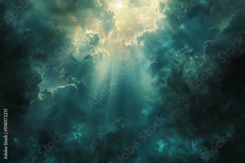© Bundi, Obraz premium Sunlight streaming through the clouds as the sun sets. Stunning.