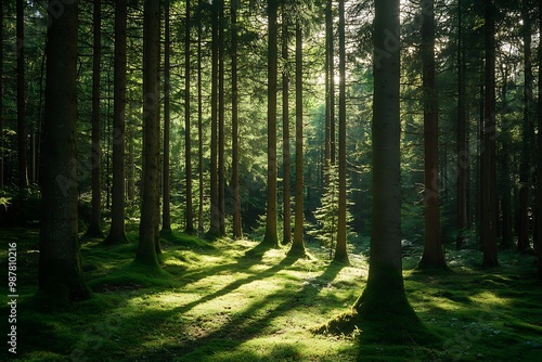 © atar, Obraz premium Sunlight streaming through the trees in a dense green forest