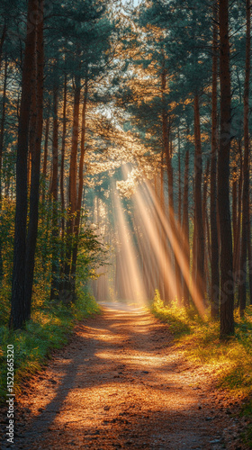 Fototapeta premium Sunlight streaming through the trees in the forest. Morning walk. For book...