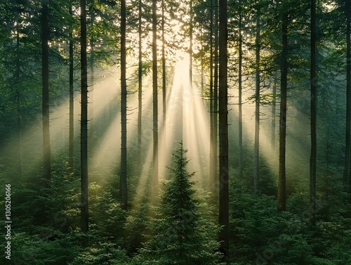 Obraz premium Sunlight streaming through trees enchanted forest nature photography serene...