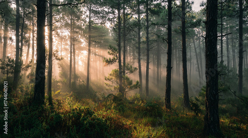 Fototapeta premium Sunlight streaming through trees in a forest with dense ground vegetation and misty atmosphere creating depth