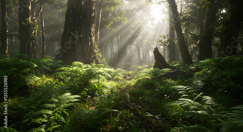 © WAHYU, Fototapeta premium Sunlight Streaming Through Trees in a Lush Fern Filled Forest