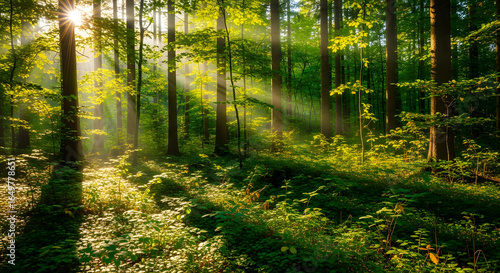 Obraz premium Sunlight Streaming Through Trees in a Lush Forest