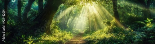 Obraz premium Sunlight streaming through trees in a lush, green forest, creating a magical,...
