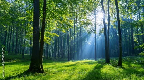 Obraz premium Sunlight streaming through trees in a lush green forest, creating a serene...