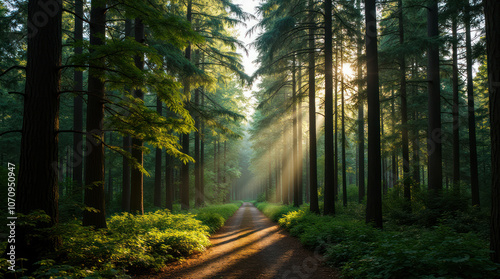Fototapeta premium Sunlight streaming through trees in a serene forest pathway at dawn