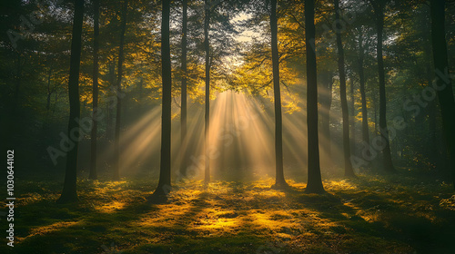 © Siasart, Naklejka premium Sunlight streaming through trees in a serene forest setting.