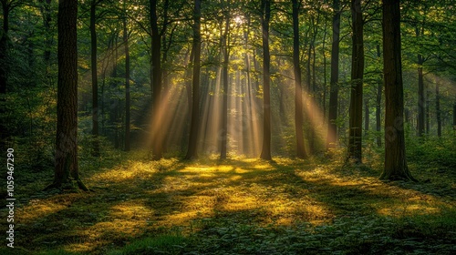 Obraz premium Sunlight Streaming Through Trees in Dense Forest