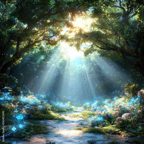 © Mayapopy, Obraz premium Sunlight Streaming Through Trees in Enchanted Forest Landscape