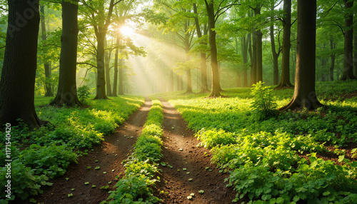 © Volha, Obraz premium Sunlight streaming through trees in serene green forest