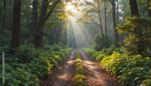 Obraz premium Sunlight streaming through trees on a forest path