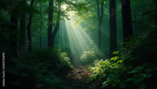 Fototapeta premium Sunlight Streaming Through Trees on Forest Path with Green Foliage