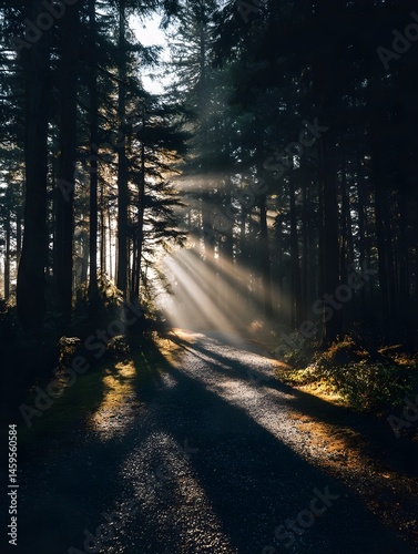 © Rony, Naklejka premium Sunlight streaming through trees onto a peaceful forest path in the early morning