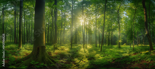 Fototapeta premium Sunlight streaming through trees, Panoramic Sunny Forest