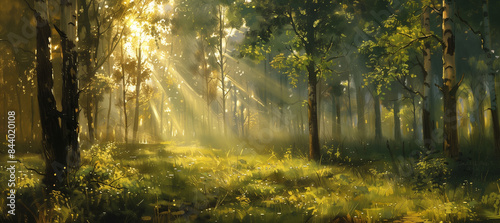 Fototapeta premium Sunlight streaming through trees, Panoramic Sunny Forest