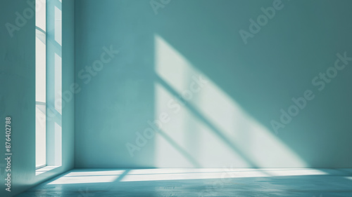 Obraz premium Sunlight Streaming Through Window Casting Geometric Shadows in Minimalist Blue Room – Tranquil, Bright, and Serene Interior Scene