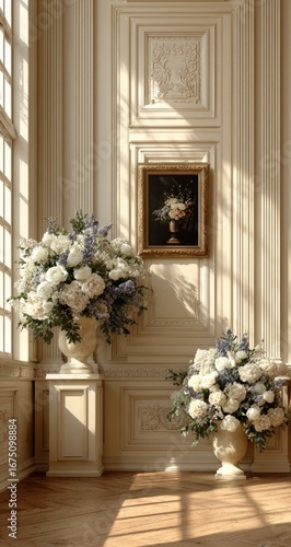 © salsa, Fototapeta premium Sunlight streams into a grand room, highlighting floral arrangements in ornate urns