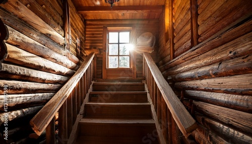 © Nicholas, Fototapeta premium sunlight streams into a rustic log cabin hallway with wooden stairs