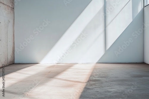 Fototapeta premium Sunlight streams into an empty room, casting shadows on a light-colored concrete floor and wall