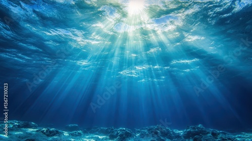 Fototapeta premium Sunlight streams into the deep, blue ocean water from above the surface. Use it for oceanography, marine life, or inspirational, calming backgrounds.