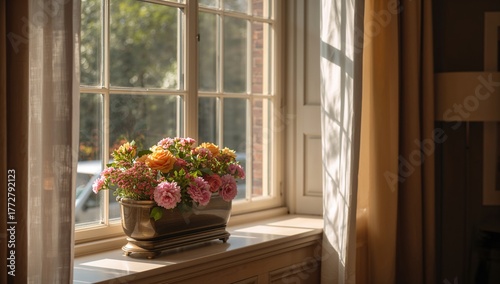 Fototapeta premium Sunlight streams onto a planter and window ledge in a living room, enhancing...