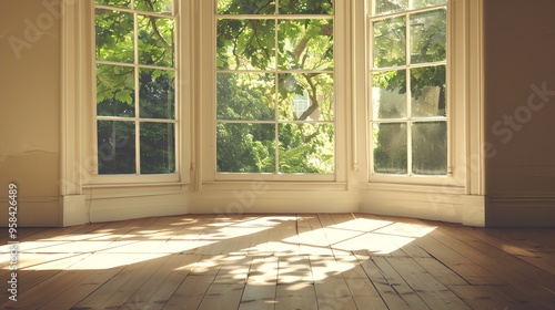 © Galib, Fototapeta premium Sunlight streams through a bay window onto a wood floor.