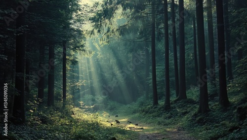 © Selsi, Naklejka premium Sunlight streams through a dark forest
