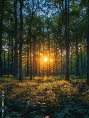 Obraz premium Sunlight streams through a dense forest