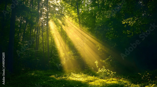 © Ali, Obraz premium Sunlight streams through a dense forest.