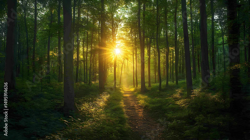 © Ali, Obraz premium Sunlight streams through a dense forest.