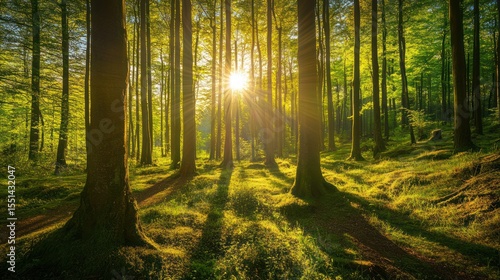 Obraz premium Sunlight streams through a dense forest