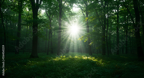© wisual studio, Obraz premium Sunlight streams through a dense forest (1)