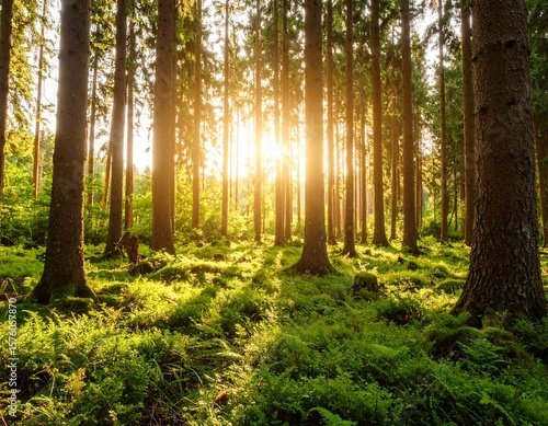 © Dani, Fototapeta premium Sunlight streams through a dense forest (1)