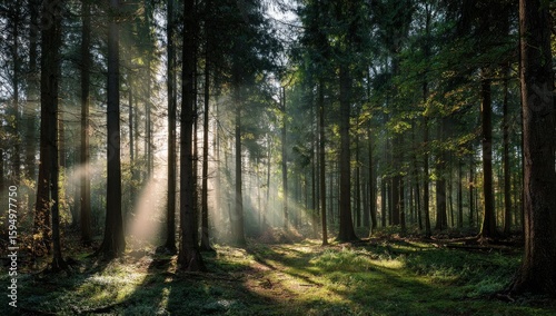 Fototapeta premium Sunlight streams through a dense forest