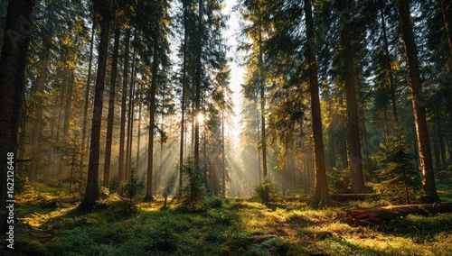 © Neni, Fototapeta premium Sunlight streams through a dense forest