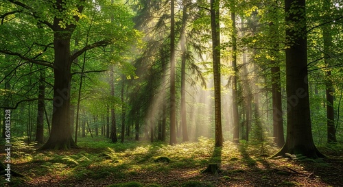 © DWI, Obraz premium Sunlight streams through a dense forest.
