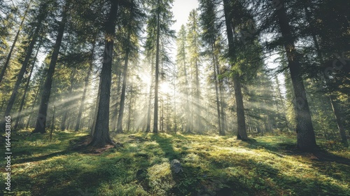 © Ariestia, Obraz premium Sunlight streams through a dense forest.