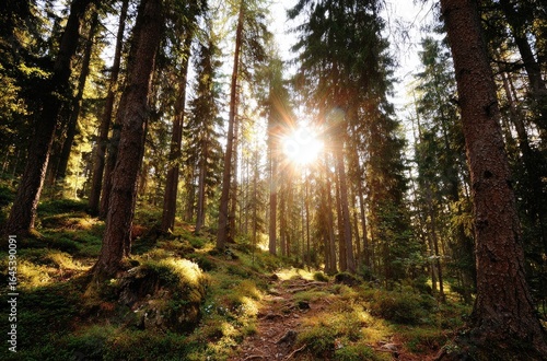 © syakila, Fototapeta premium Sunlight streams through a dense forest