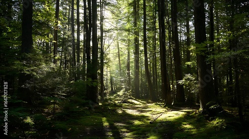 © Wida, Obraz premium Sunlight streams through a dense forest.